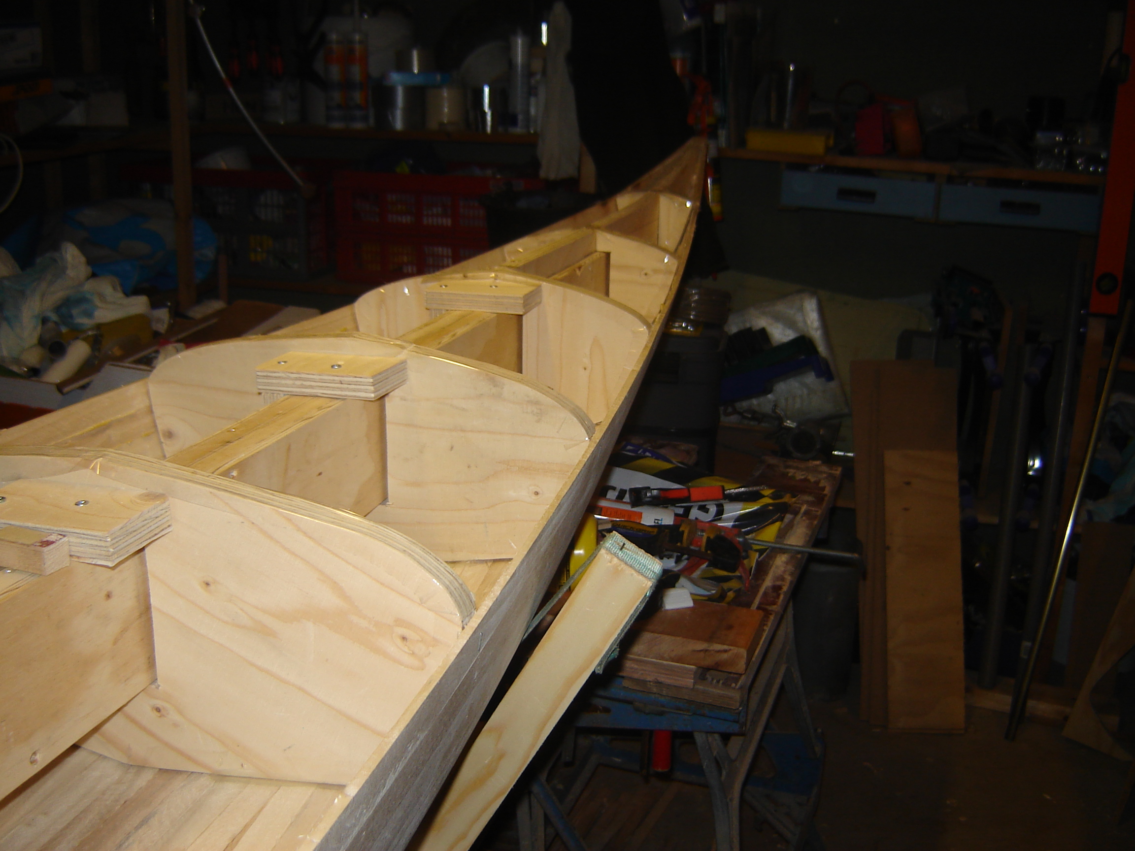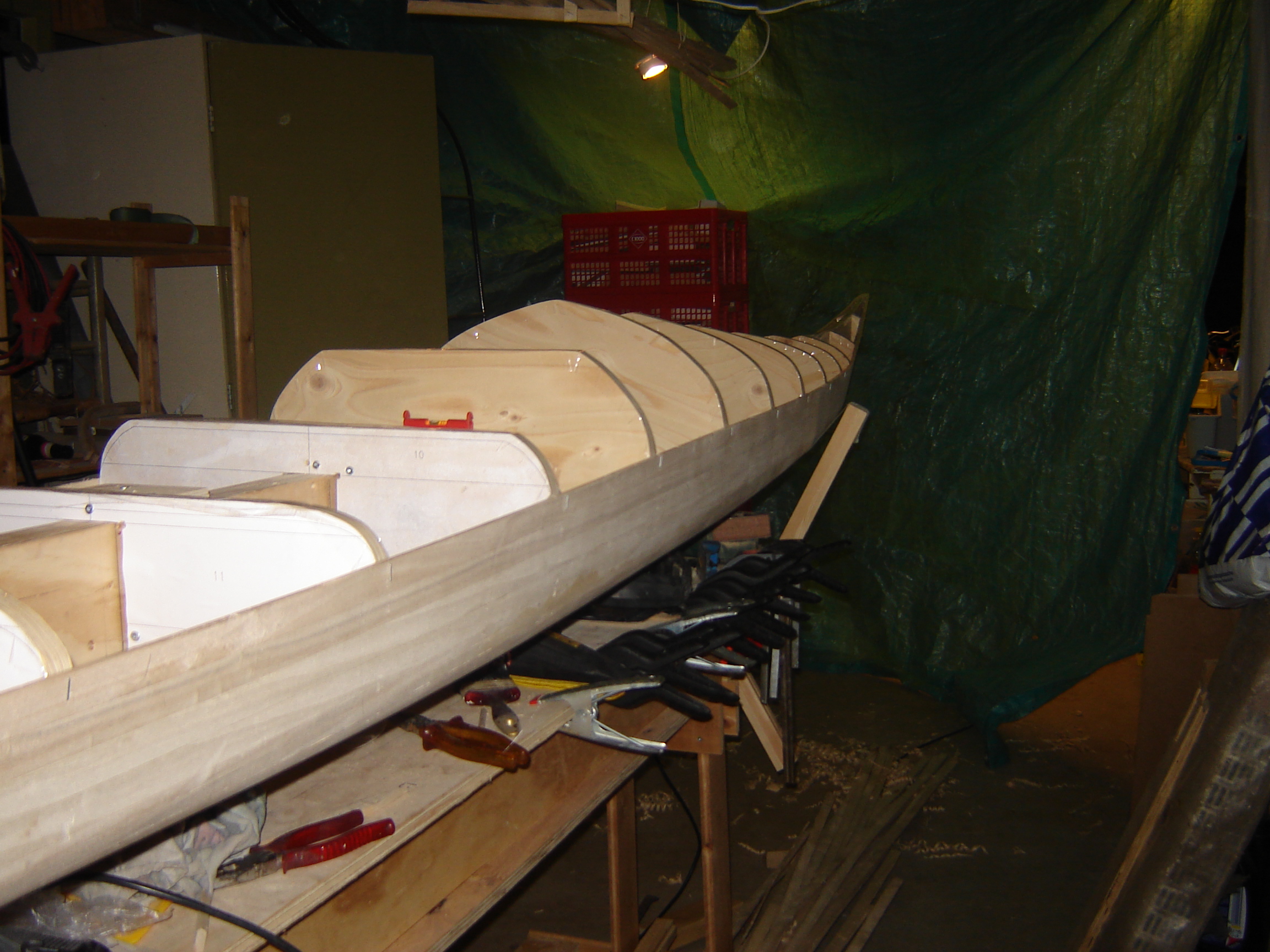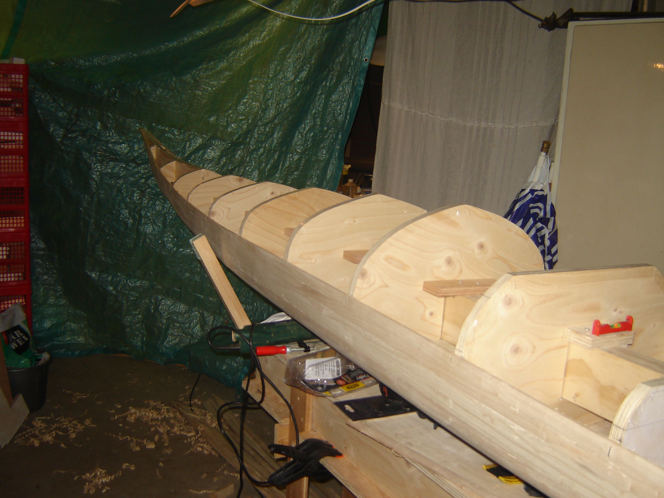 To turn the kayak I had to change the support in the external strong back. I hung the kayak in slings to the ceiling and altered the support then lowered the kayak into it.