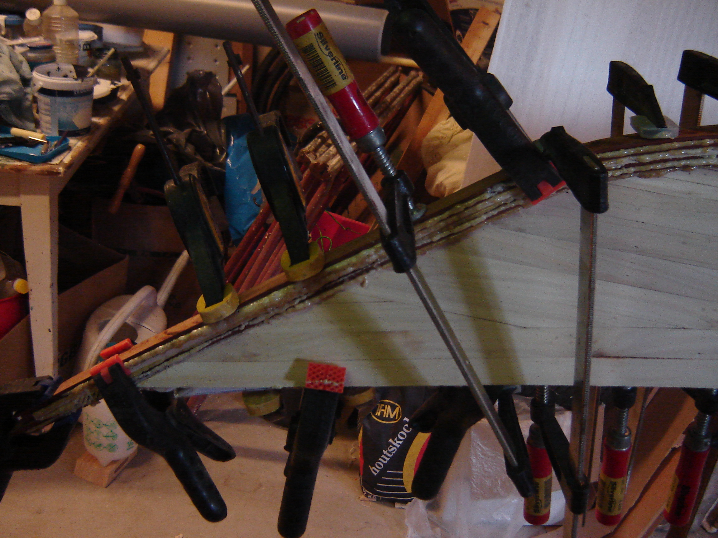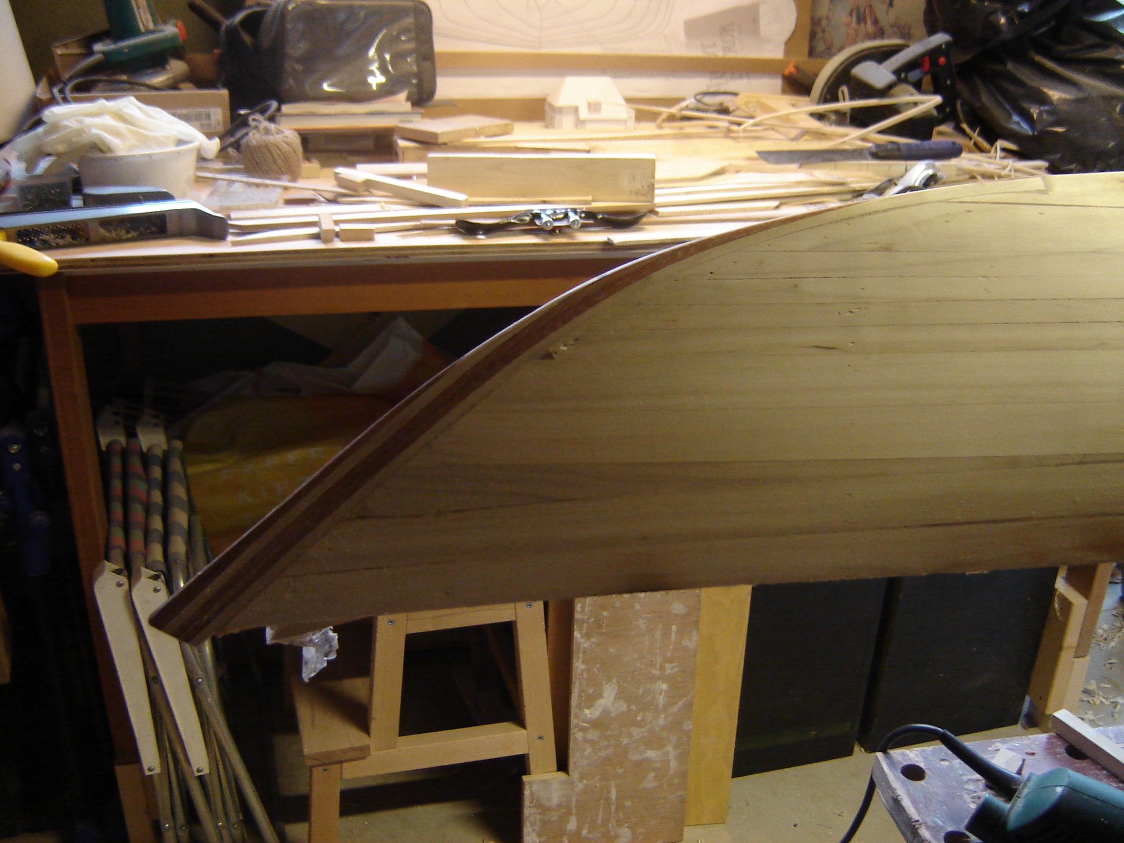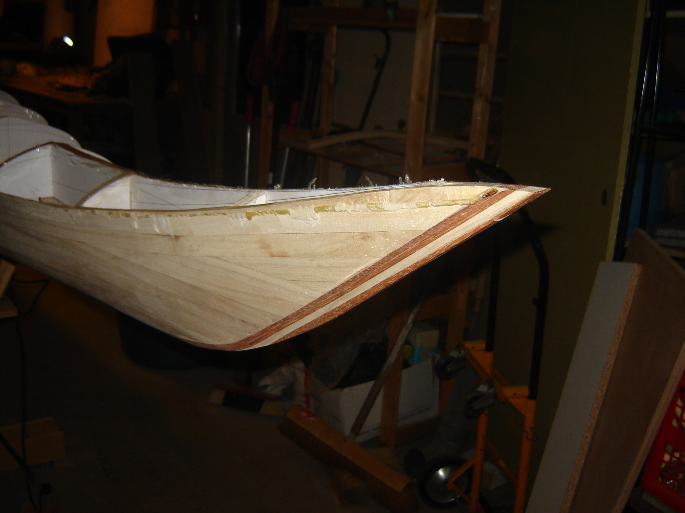 The next problem to solve is the big change in deck angle for the first strips at the shear. At the ends the strip is almost laying flat so the side of the strip will touch the edge of the last hull strip. Two frames from the end the edge of the strip has to make contact with the hull. How do I bevel that?