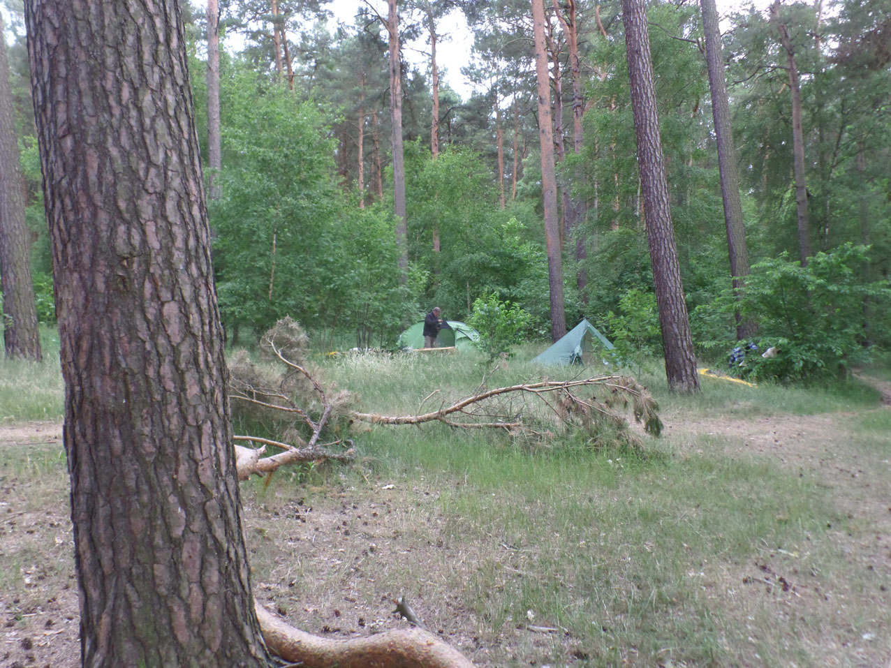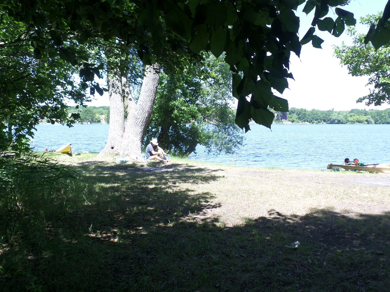 Er waren een paar medekampeerders. Een groepje stond er al wat langer en werd met een auto opgehaald. Eén deed ook de Mearkische Umfahrt maar veel sneller dan wij. Hij was deze ochtend uit Erkner vertrokken en wilde de hele tocht in 4 dagen doen. Het kan maar dan moet je gemiddeld 45 km per dag afleggen en dat is heel wat als je ook moet overdragen en schutten. Maar ja hij was nog jong en had heel wat meer energie dan zeventigers zoals wij.