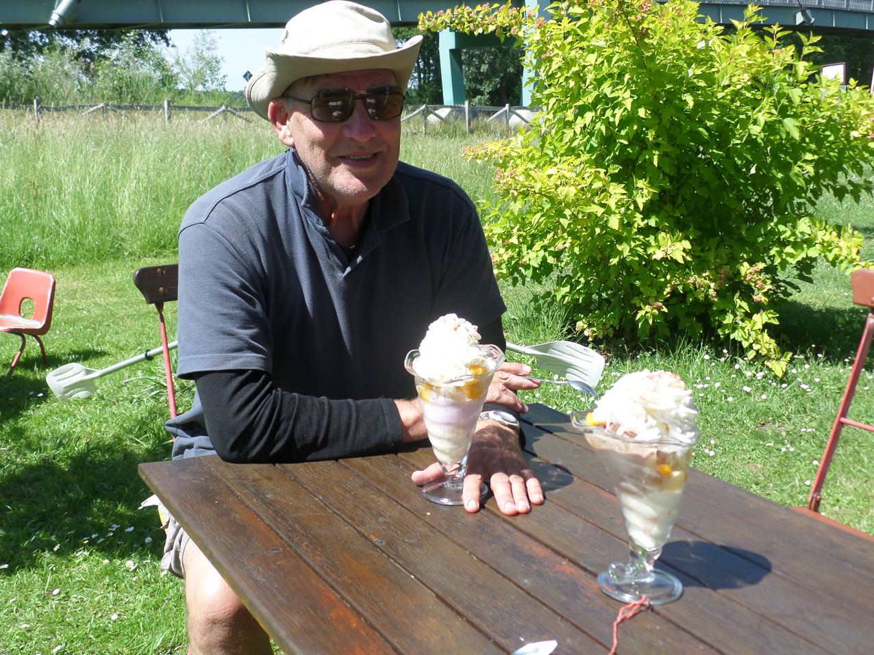 Ijspauze bij Kudels Lustige Stube vlakbij de fietsbrug aan het begin van de Dolgensee