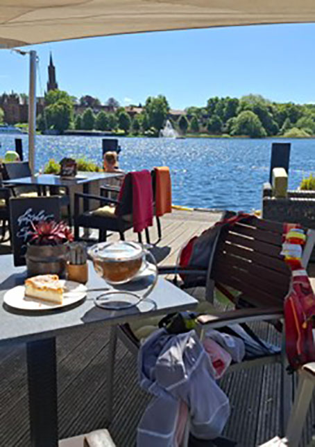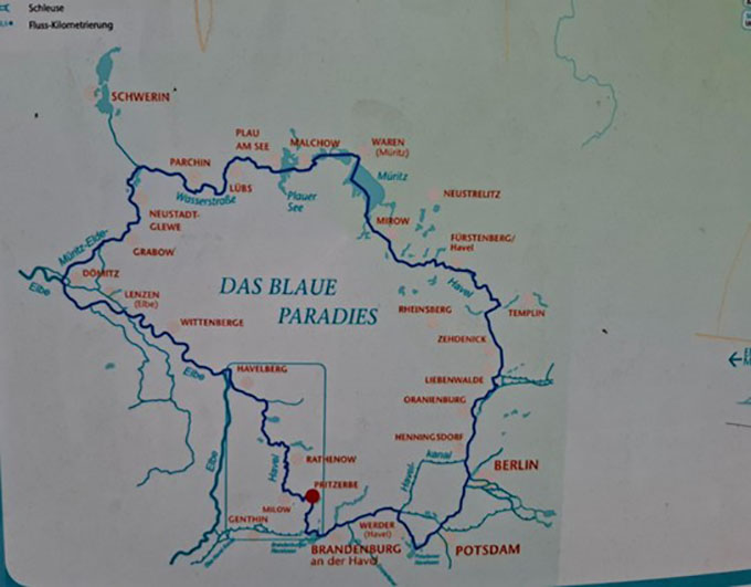 Onderweg kwam ik meerdere informatieborden tegen over dit gebied van de Havel, Elbe en Mecklenburger Seenplatte. Het bleek bekend te staan als Das Blaue Paradies, Europa’s grootste genetwerkte watersportgebied. De route die op informatieborden aangegeven stond, heb ik bij de Müritzsee iets aangepast door het mooie Bolter Kanal te nemen. Het water is daar zo helder dat je de vissen ziet zwemmen. Verder ben ik een paar dagen van de route afgeweken voor een bezoek aan Rheinsberg en omgeving maar ook Schwerin had zich hier goed voor geleend.