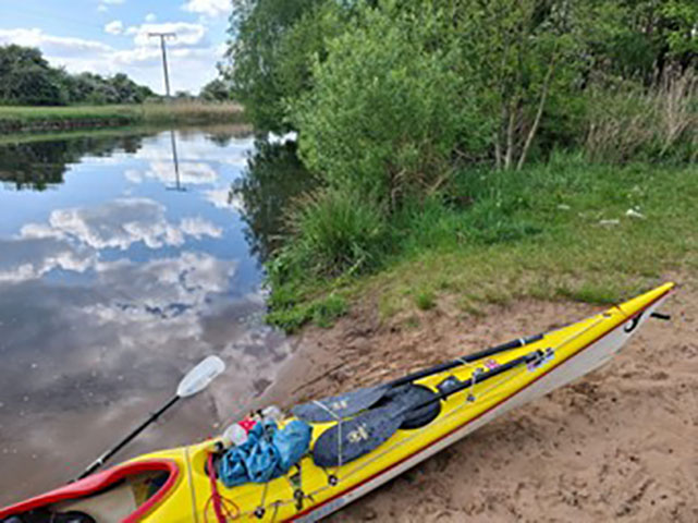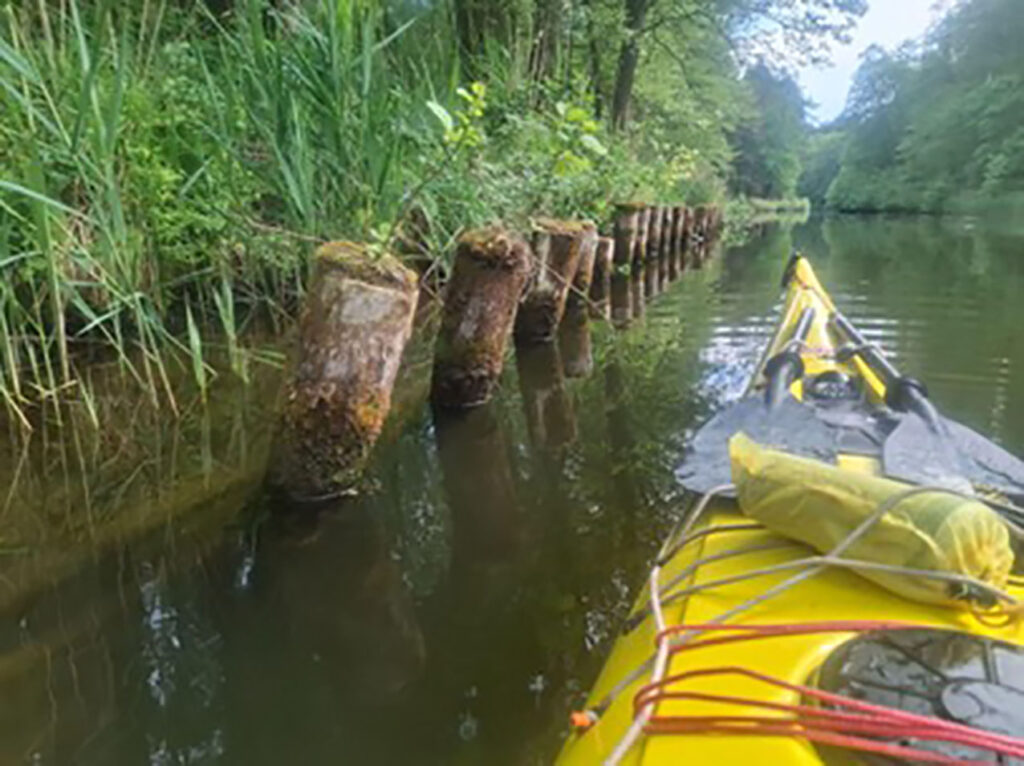 Onderweg waren er genoeg mogelijkheden om uit te stappen voor een pauze. In de vorm van strandjes, veldjes of steigertjes in wisselende condities. Soms moest ik wat balancerende capriolen uithalen of gebruikte ik de betonnen rand onder een brug. Tot mijn teleurstelling zag ik op een traject werkzaamheden waarbij de mooie idyllische oevers met de bemoste beschoeiing paaltjes vervangen werden door stenen wallen. Deze paaltjes konden blijkbaar geen weerstand bieden tegen de hekgolven van de motorboten en het afkalven van de wal tegen gaan. Zo’n stenen wal is niet alleen lelijk maar ook hopeloos om uit je kano te stappen.