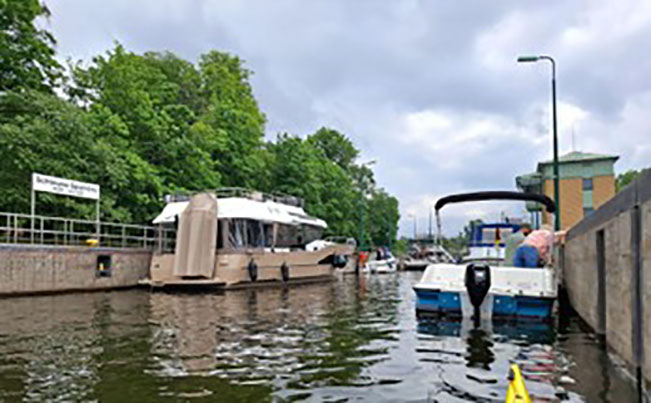 Bij mijn vertrek bij de kanovereniging Zugvogel in Berlijn werd mij ook nadrukkelijk uitgelegd hoe ik het overdraagsysteem bij Schleuse Spandau kon gebruiken. Voor de vorm ging ik er dus even kijken om daarna snel aan te sluiten bij de plezierjachten om gewoon met hen mee geschut te worden. Meestal ging het schutten vrij vlot en gebruikte ik deze tijd voor een eetpauze en werkte ik mijn reisverslag bij.