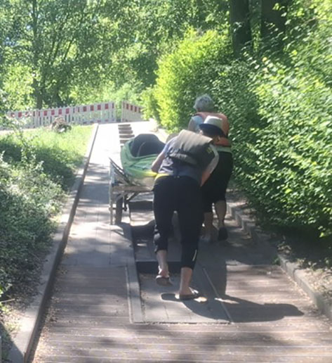 Bij de grote Lehnitz Schleuse bij Oranienburg werd me toch gesommeerd het onovertroffen overdraagsysteem met rails te gebruiken. Ik snapte ook wel dat het niet altijd feest kon zijn maar het is voor mij een hele workout om zo’n karretje aan de andere, lage kant van de lange sluis ( 133 meter) op te halen en naar boven te trekken.Ik was er dus best trots op toen mijn zwaar beladen kano op het karretje lag. Ik begon net aan het hachelijke traject met dit hele gevaarte naar de overkant toen ik de sluisdeuren zag opengaan en ik de motorjachten er vrolijk en onbekommerd uit zag varen…Spontaan sloeg de stoom uit mijn oren bij zoveel onrechtvaardigheid in deze wereld. Dit of mijn grijze haren maakte zoveel indruk op de sluiswachter dat hij niet wist hoe snel hij de sluis alsnog voor mij alleen moest bedienen. Toen de deuren open gingen moest ik er wel rap uit peddelen want één van de weinige binnenvaartschepen op dit wat saaie kanaal kwam al aan stomen.