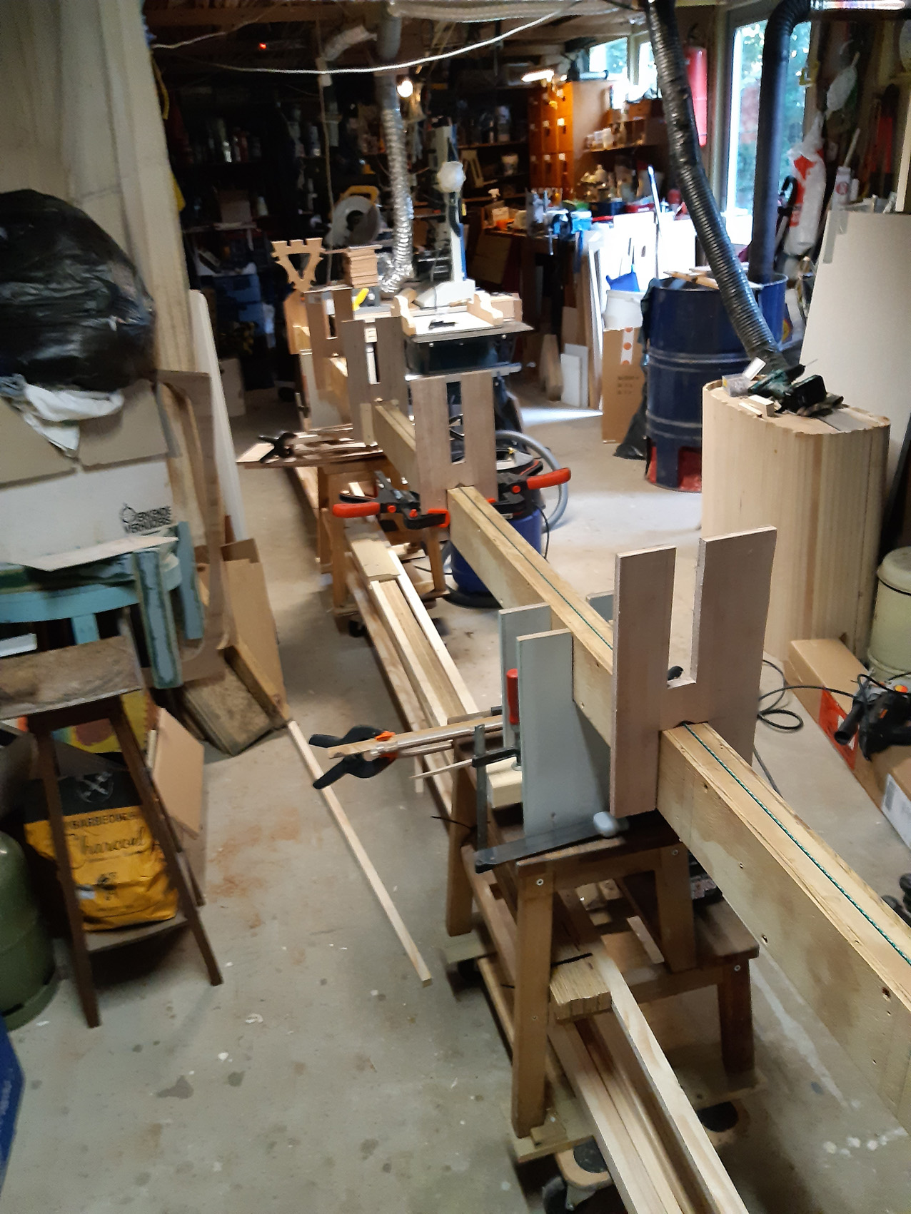 Voor het lassen heb ik een hulpstuk gemaakt voor op de lintzaag. Hiermee kun ik de latten allemaal op dezelfde schuinte afzagen zodat ik ze weer recht aan elkaar lijmen kon. Het lijmen is gedaan met spleetvullende PU-lijm.