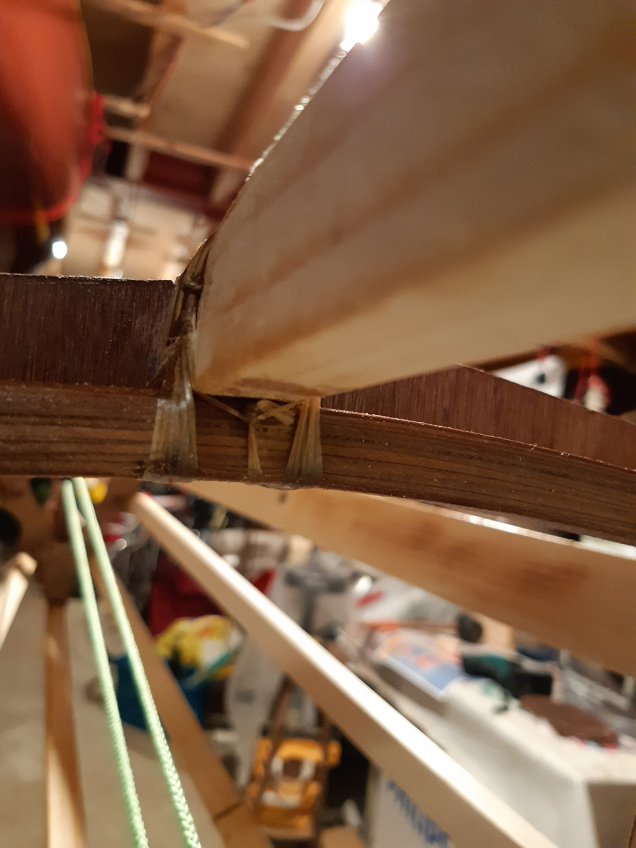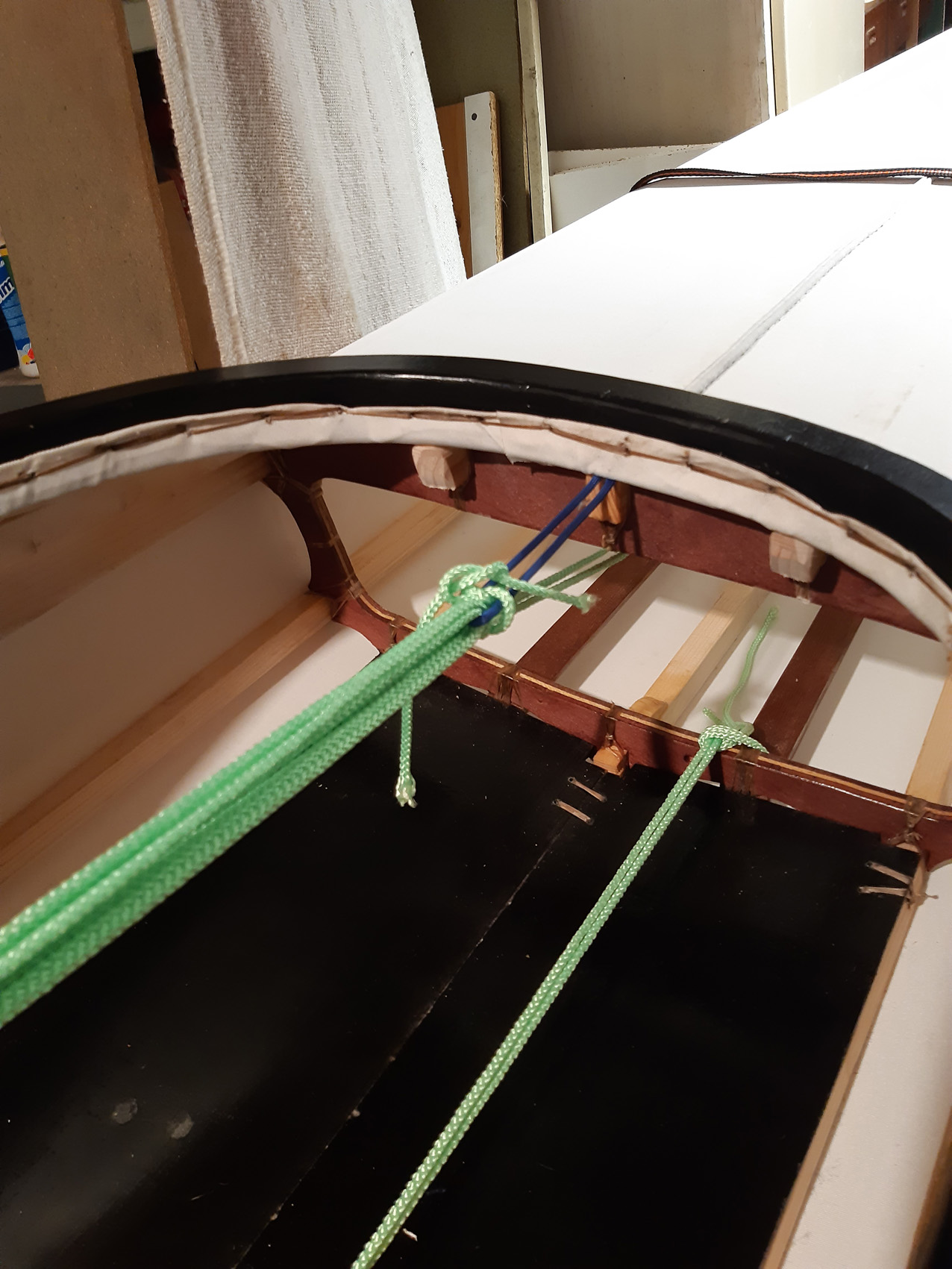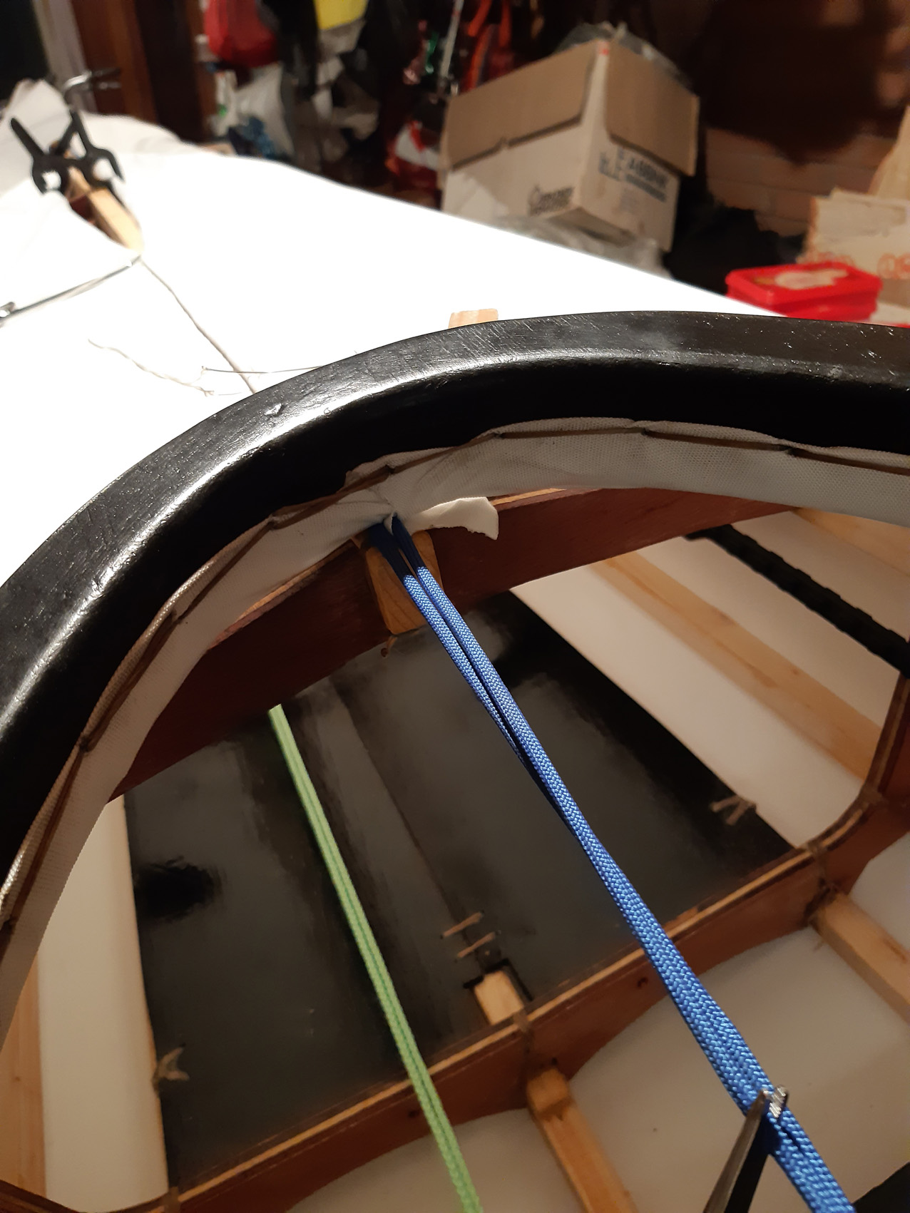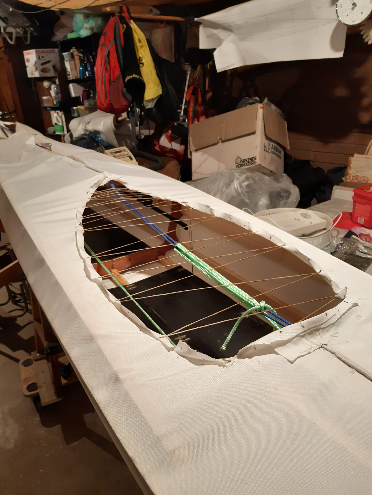 De gunwales en de onderste stringers moesten met de verfafbrandföhn flink heet gestookt worden om de juiste twist en buiging te krijgen maar dat lukt prima. De gunwales en de bovenste stringers met deuvels vastgezet aan de stevens. Daarna alles vastezet met bindsels. Hiervoor heb ik de ‘flat waxed artificial sinew’ gebruikt die ook Jeff Horton van Kudzucraft levert. Ook het polyester doek (9 oz tight weve) heb ik bij hem gekocht.