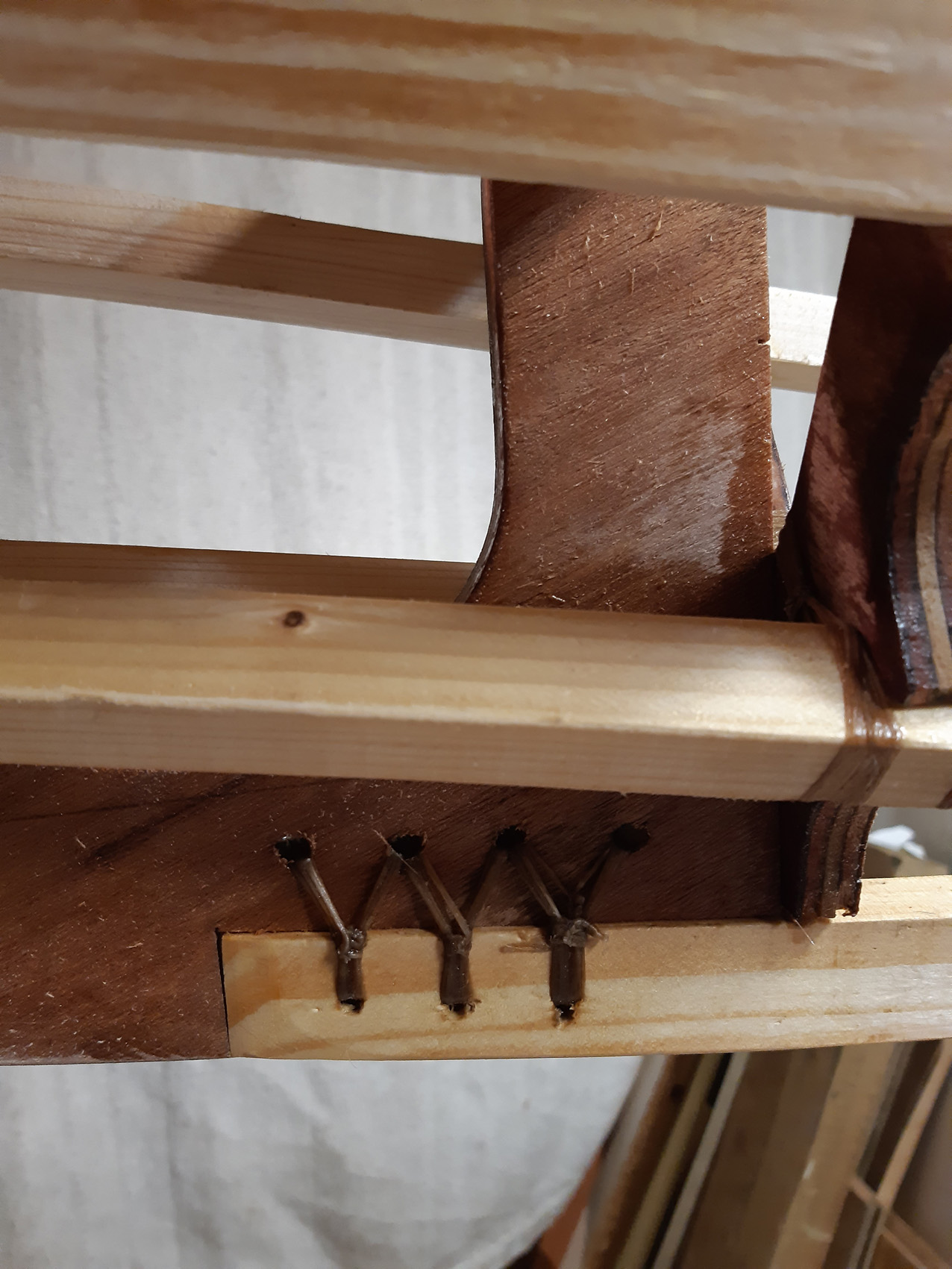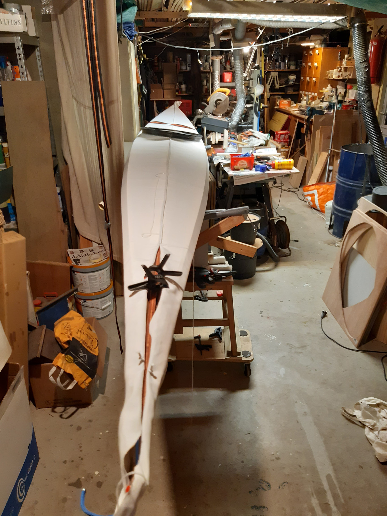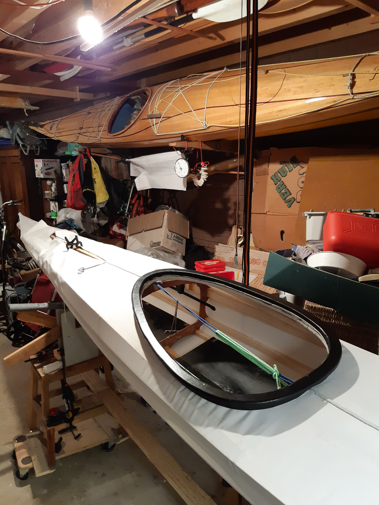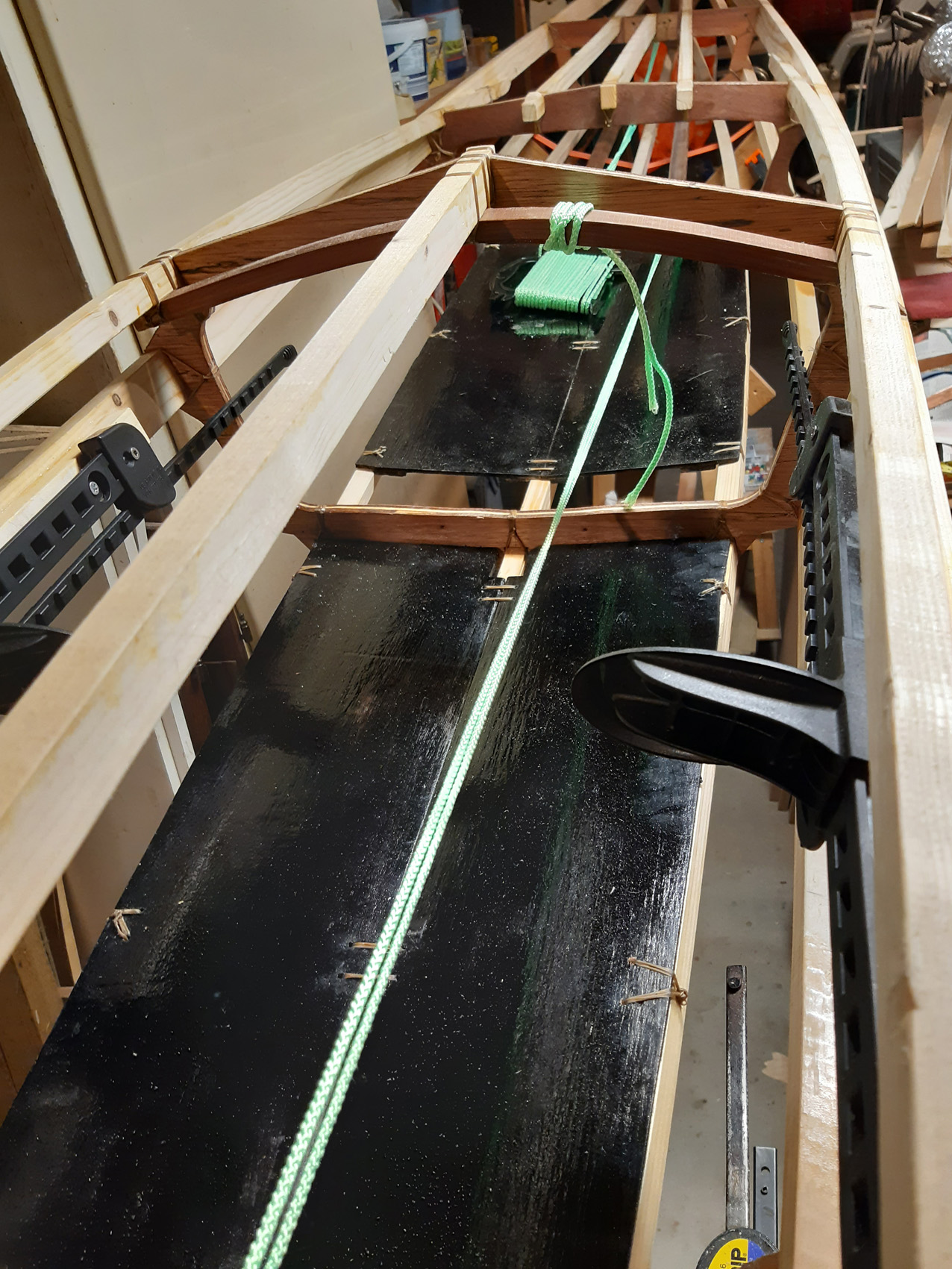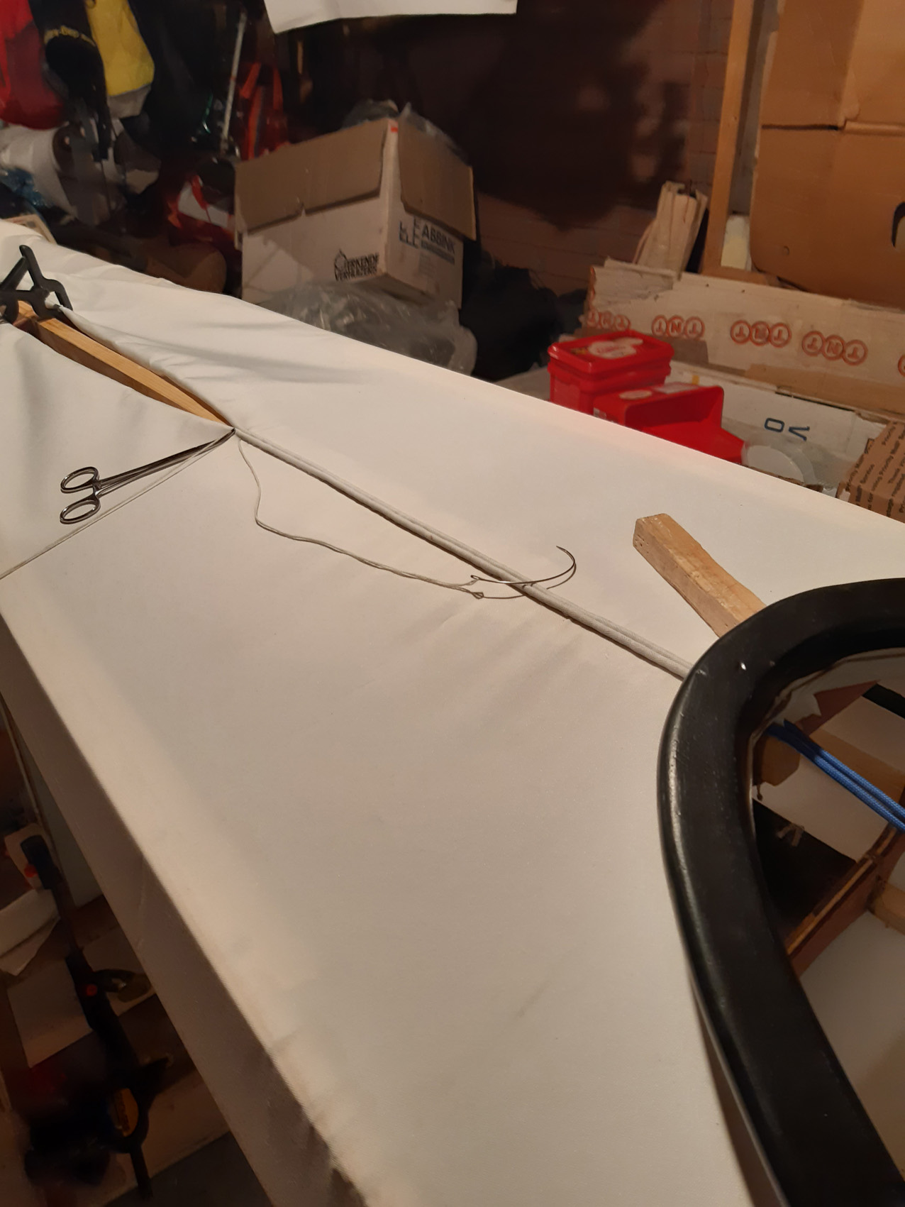 De gunwales en de onderste stringers moesten met de verfafbrandföhn flink heet gestookt worden om de juiste twist en buiging te krijgen maar dat lukt prima. De gunwales en de bovenste stringers met deuvels vastgezet aan de stevens. Daarna alles vastezet met bindsels. Hiervoor heb ik de ‘flat waxed artificial sinew’ gebruikt die ook Jeff Horton van Kudzucraft levert. Ook het polyester doek (9 oz tight weve) heb ik bij hem gekocht.