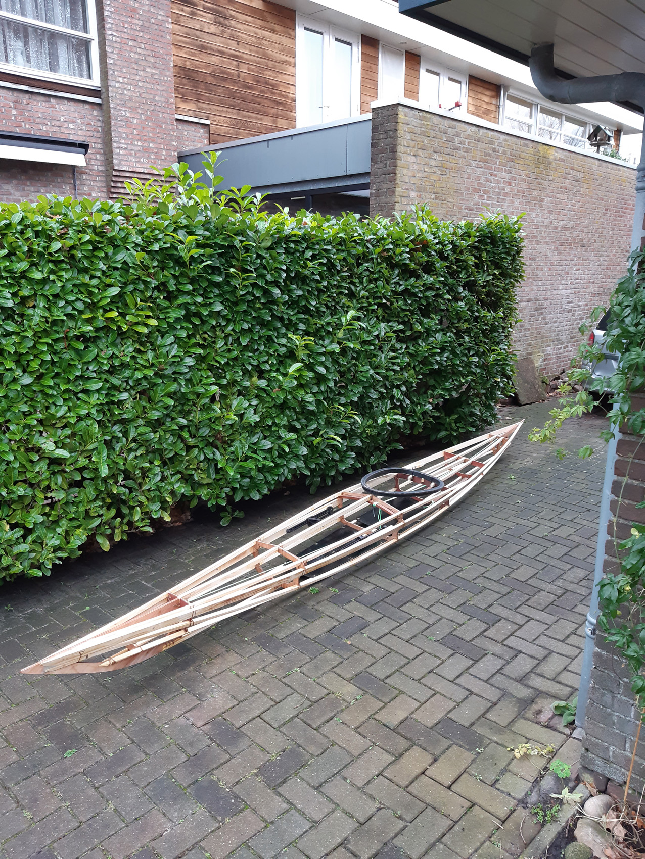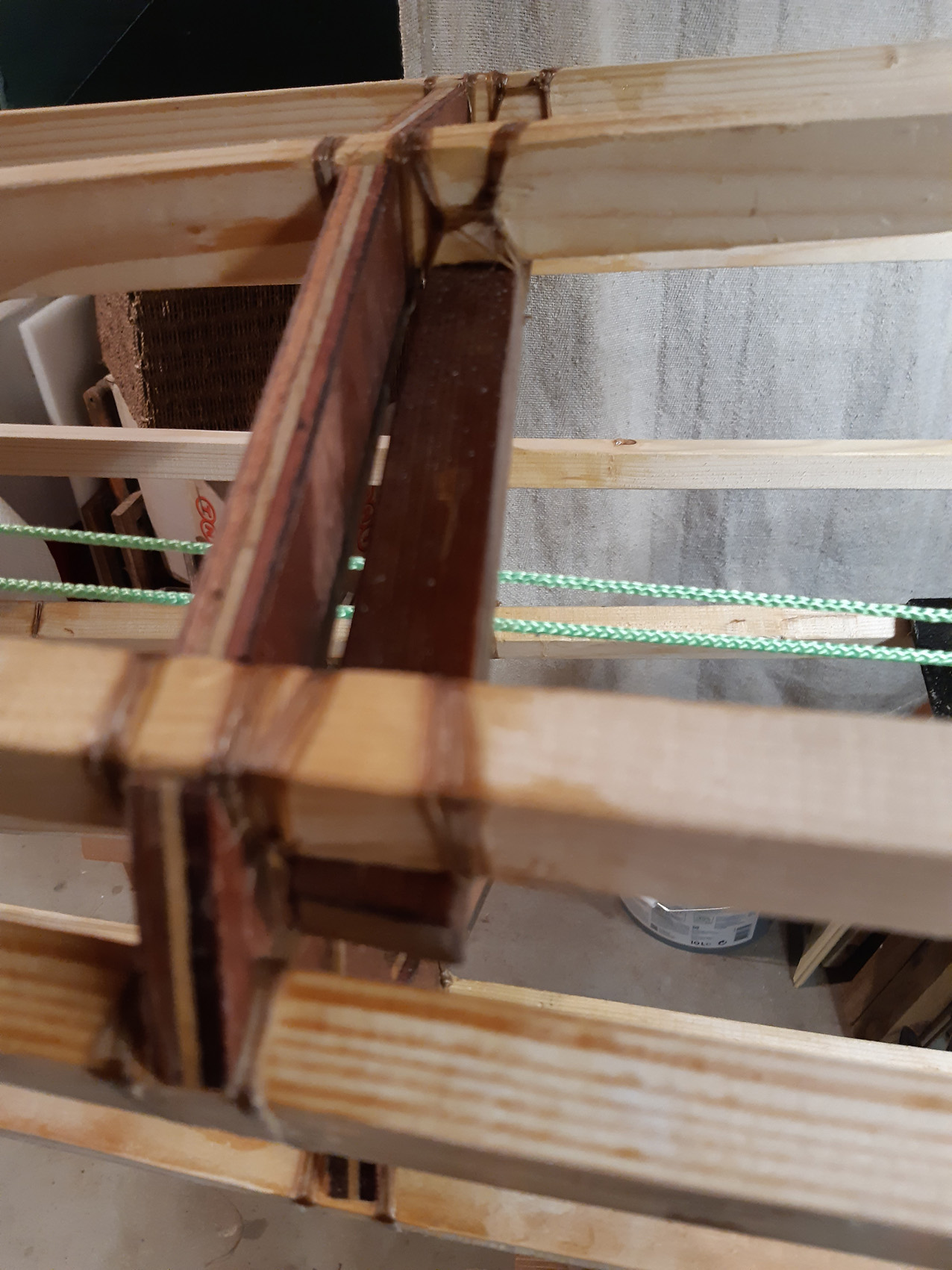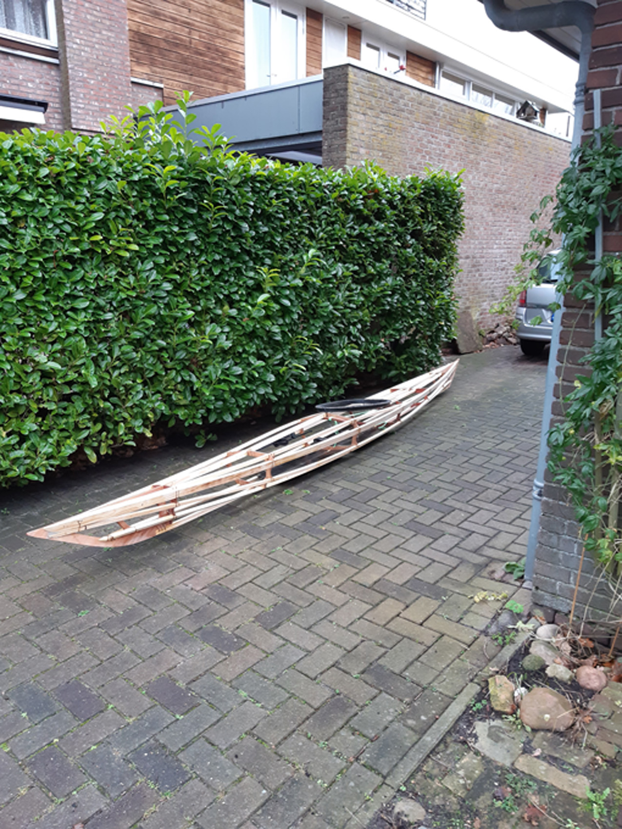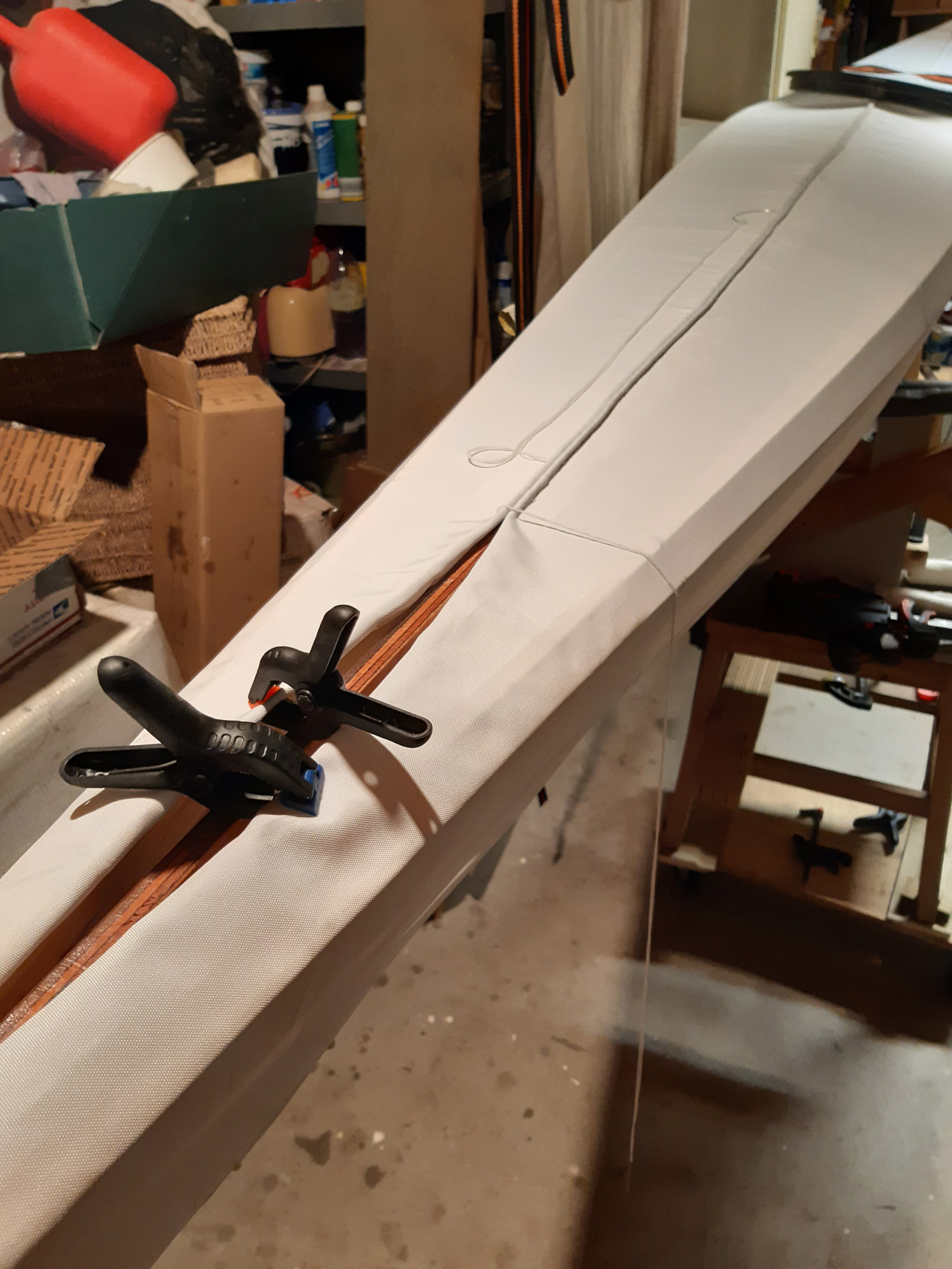 De gunwales en de onderste stringers moesten met de verfafbrandföhn flink heet gestookt worden om de juiste twist en buiging te krijgen maar dat lukt prima. De gunwales en de bovenste stringers met deuvels vastgezet aan de stevens. Daarna alles vastezet met bindsels. Hiervoor heb ik de ‘flat waxed artificial sinew’ gebruikt die ook Jeff Horton van Kudzucraft levert. Ook het polyester doek (9 oz tight weve) heb ik bij hem gekocht.