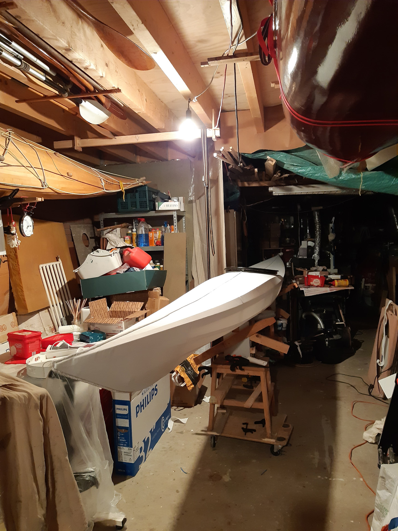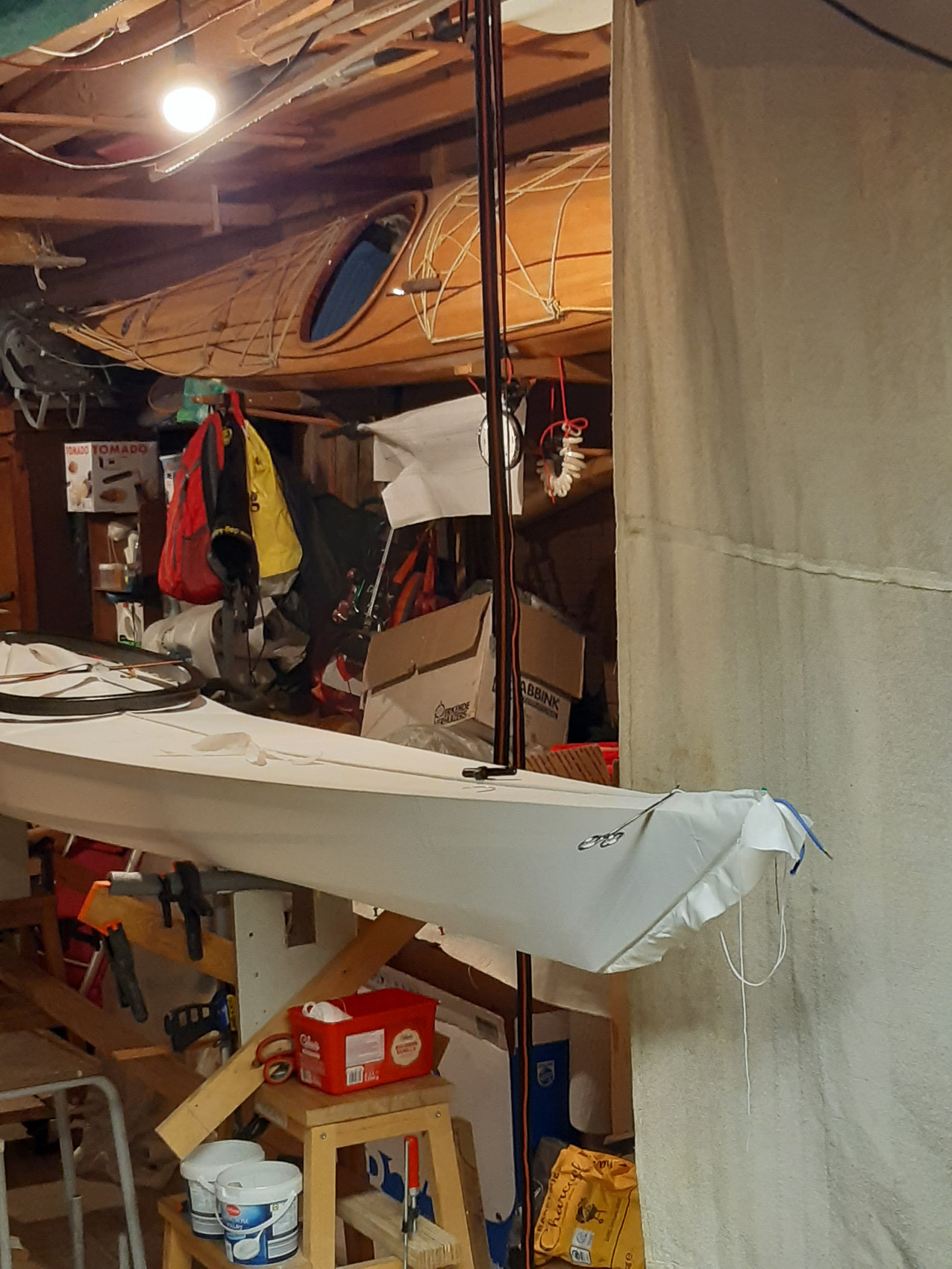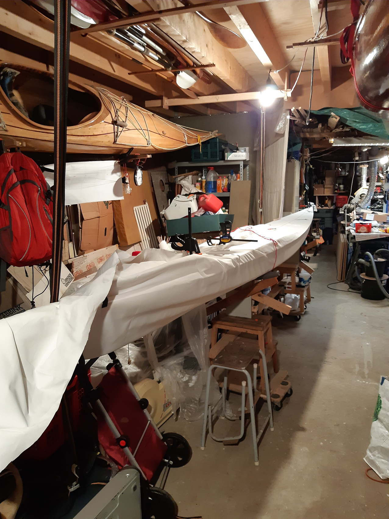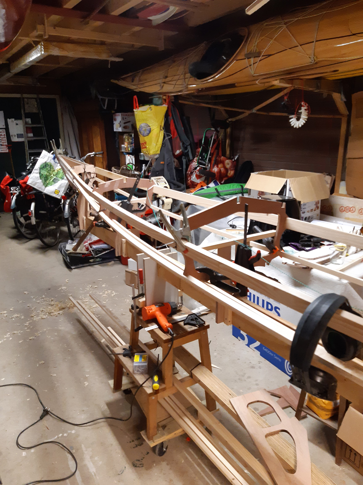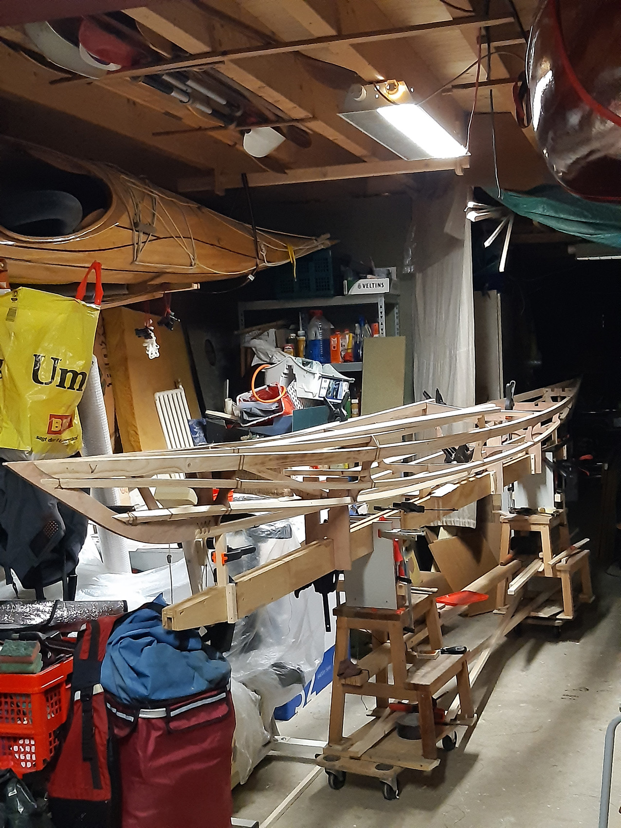 De gunwales en de onderste stringers moesten met de verfafbrandföhn flink heet gestookt worden om de juiste twist en buiging te krijgen maar dat lukt prima. De gunwales en de bovenste stringers met deuvels vastgezet aan de stevens. Daarna alles vastezet met bindsels. Hiervoor heb ik de ‘flat waxed artificial sinew’ gebruikt die ook Jeff Horton van Kudzucraft levert. Ook het polyester doek (9 oz tight weve) heb ik bij hem gekocht.