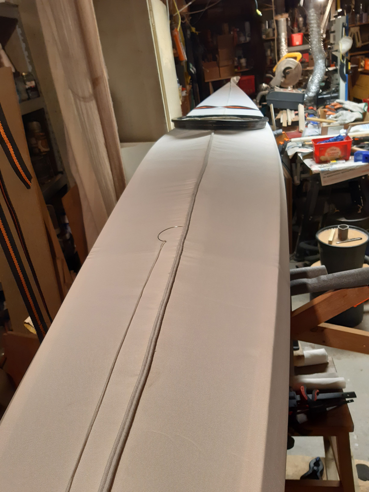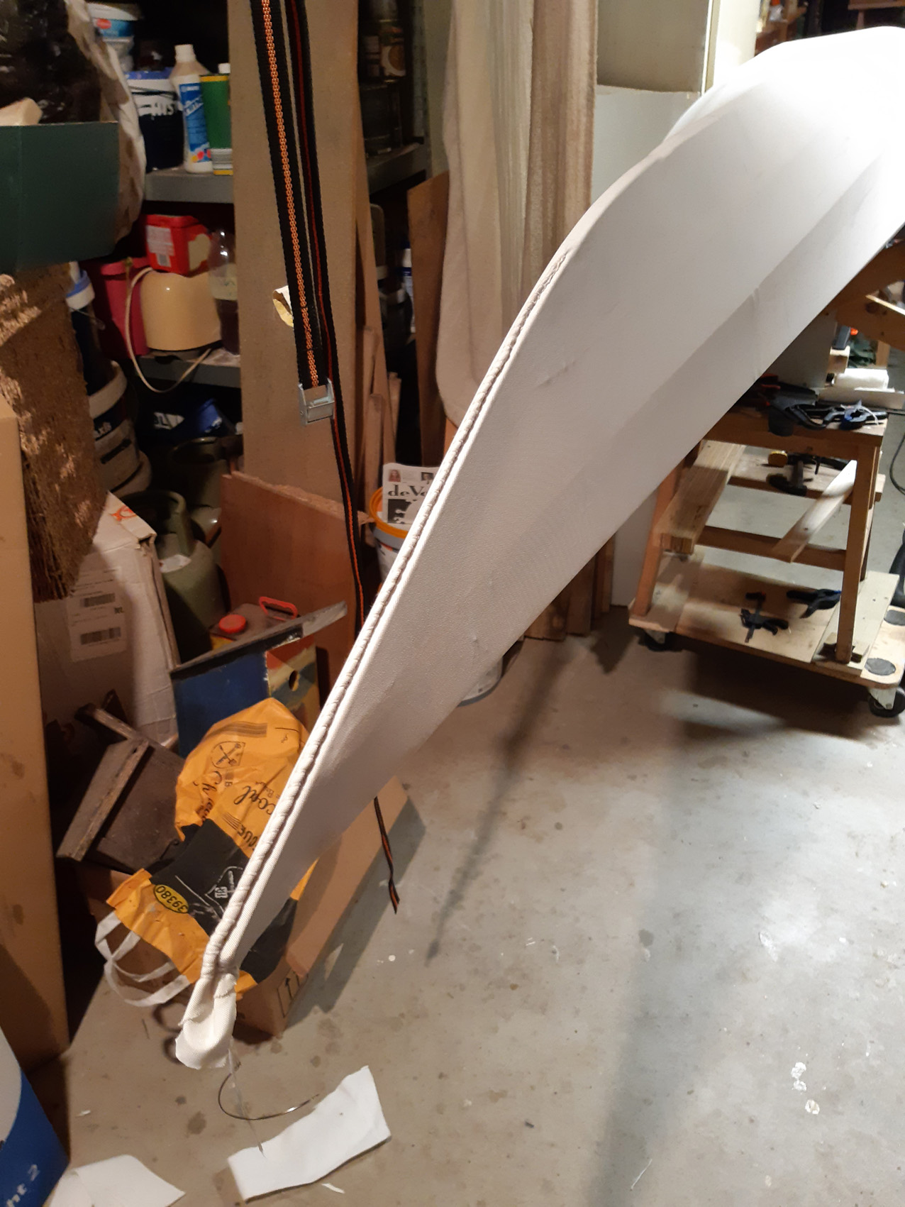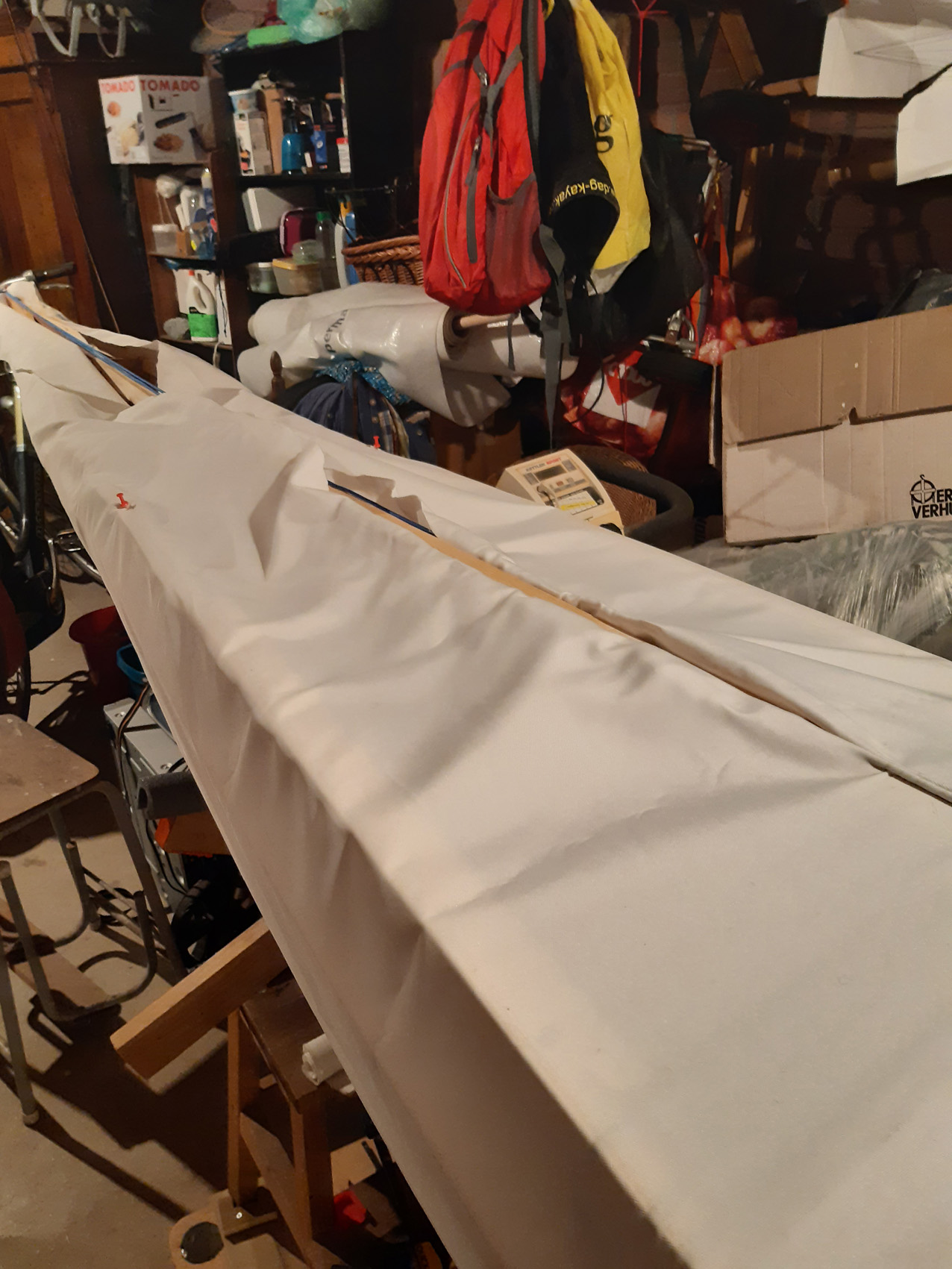 Na het naaien zate in het dek en vooral om de kuip behoorlijk wat plooien die ik er met het strijkijzer gelukkig goed uit kon strijken (heat shrinking).