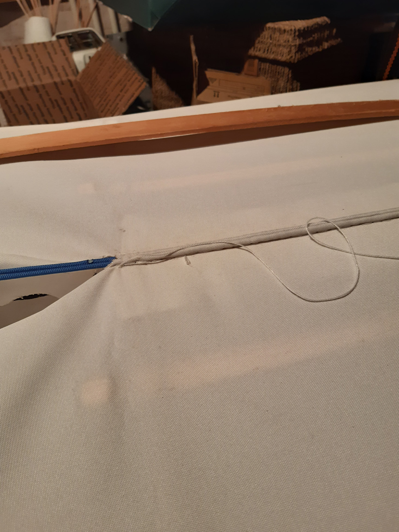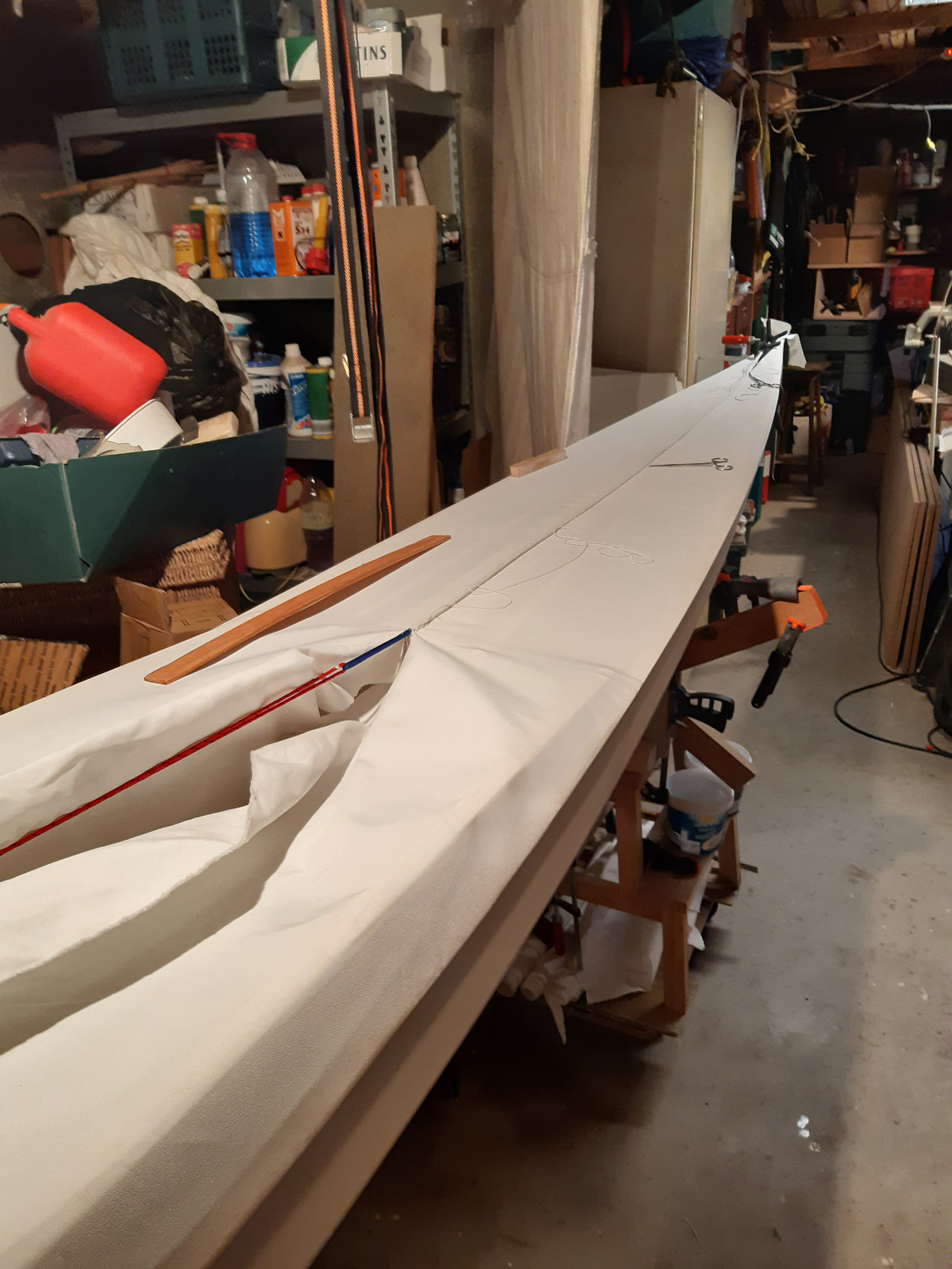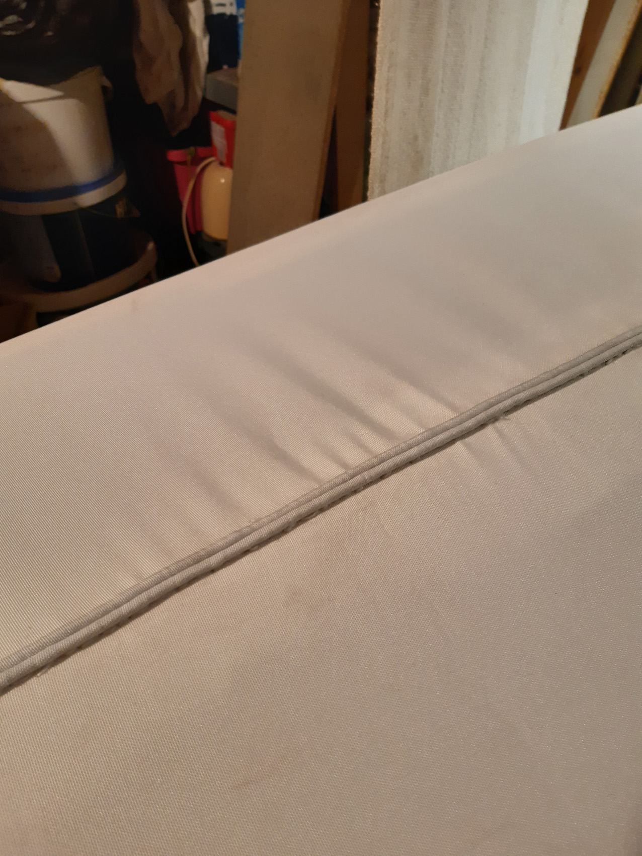 Na het naaien zate in het dek en vooral om de kuip behoorlijk wat plooien die ik er met het strijkijzer gelukkig goed uit kon strijken (heat shrinking).