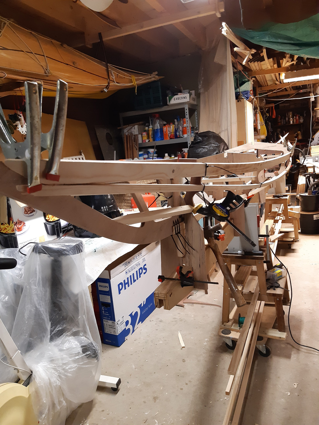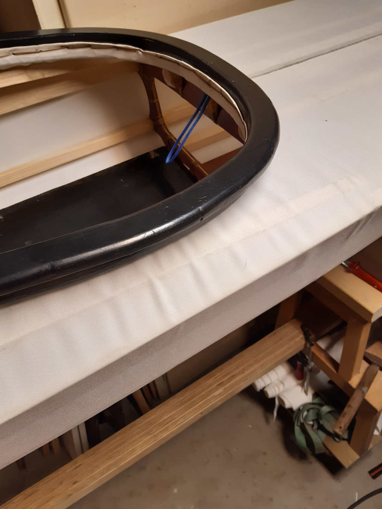 De kuiprand is gemaakt van drie lagen multiplex. De bovenste groter om een rand te krijgen voor het spatzeil. Rondom van gaatjes voorzien om het doek te kunnen vastnaaien. Niet met een losse ring onder het doek waar de bovenste helft dan opgeschroefd wordt zoals Jeff Horton beschrijft. Liever had ik een met stoom gebogen kuiprand gemaakt maar het juist hout ontbrak me.