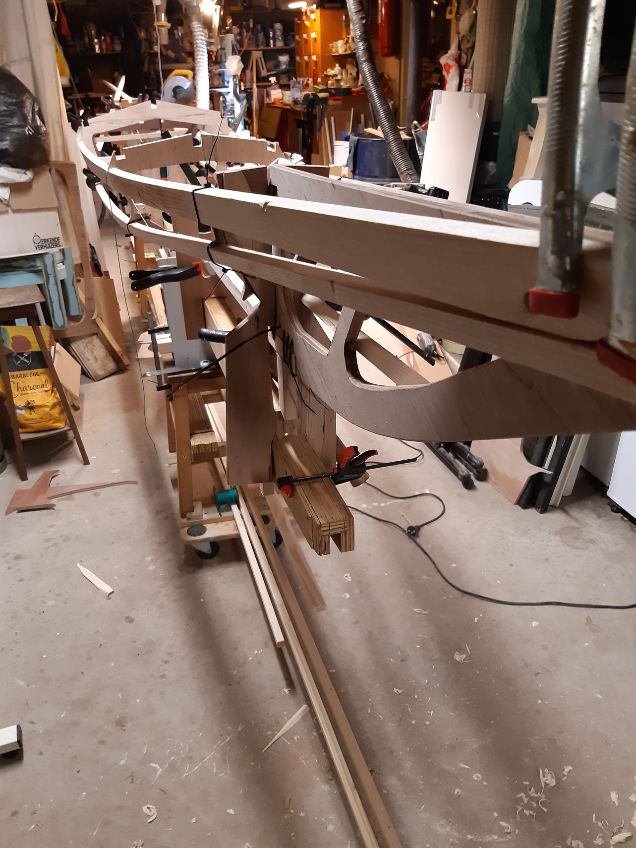 De tekeningen van de spanten (frames) uitgeknipt en op multiplex geplakt en grof uitgezaagd met de decoupeerzaag. Hierna beter uitgezaagd met de lintzaag en met de vast opgestelde bandschuurmachine precies geschuurd. Kanten gebroken (randen iets ronder gemaakt) met het handschuurblok. Achteraf had ik dit beter met de router kunnen doen want de randen zijn wat te scherp gebleven. Ook de lange delen had ik beter met de router kunnen afronden.