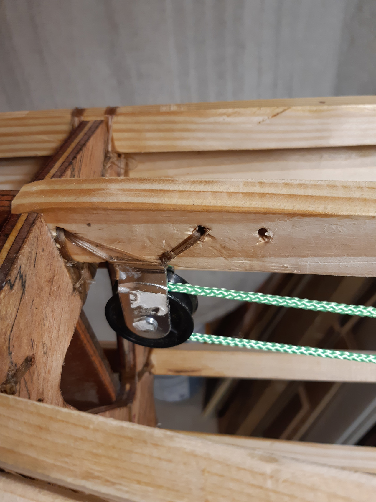In voor en achtersteven heb ik katrollen vast gezet voor lijnen om drijfzakken onder het voor- en achterdek te kunnen trekken.