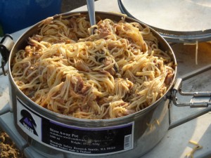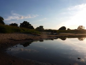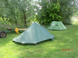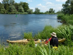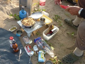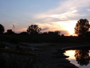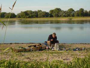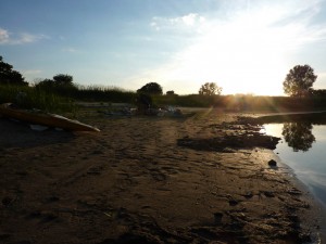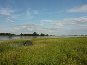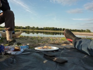 Bij elbe km 434 hadden we zin om te stoppen. We landden op een mooi zandstrandje en zetten de tentjes verderop waar het wat hoger was. Daarna de veldkeuken inrichten en heerlijk pasta met vis eten. Groente komt later wel weer.