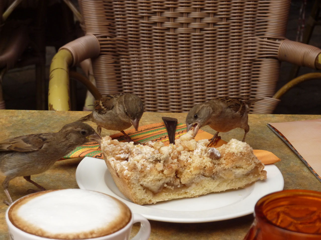 Tijdens een sanitaire stop maakten de mussen misbruik van mijn appelgebak